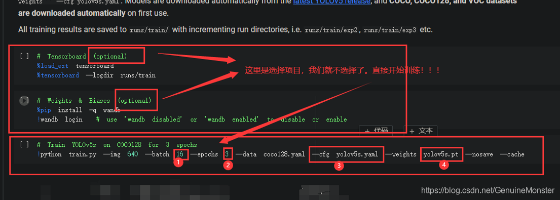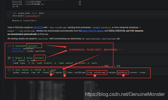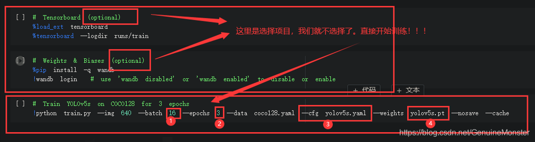 接下来,看图操作。下图中的前2个红色框后面标记了Optional,意思是待选框,可以不选。为了方便,这里就直接忽略,把目标放在最终的训练命令行。