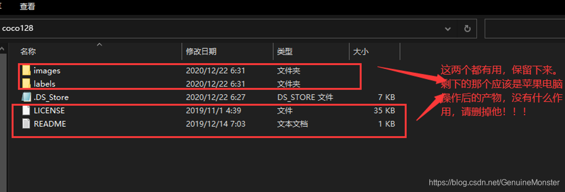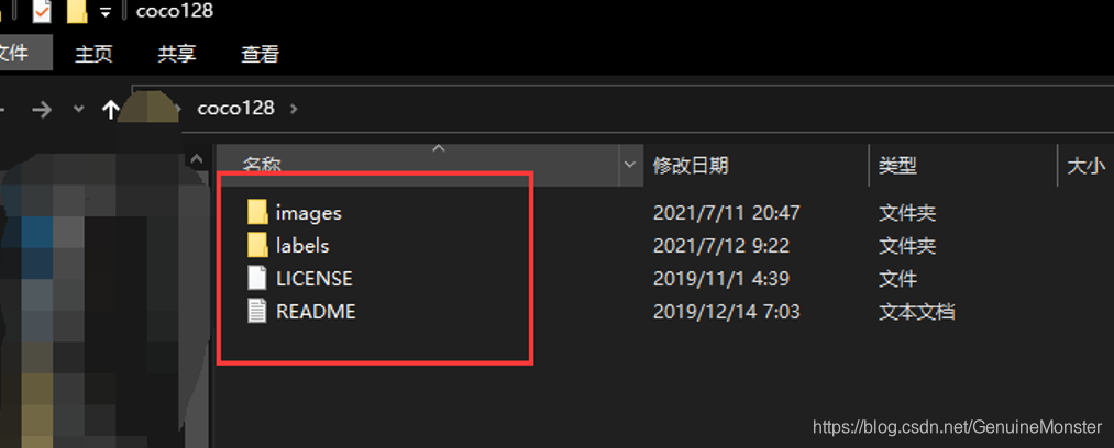 各位同学可以边阅读此篇文章,边根据目录结构准备相应的文件。可以先创建一个文件夹叫coco128,随后在这个文件夹里创建images和labels,2个文件夹。将上述截图中红色框内的2个文件拷贝到自己创建的coco128文件夹内,再按照上述介绍的文件目录把已经收集好的照片拷贝到对应的文件夹里。接下来,就可使用labelimg软件贴标签了!所以,接下来有关labelimg的操作务必非常重视。此步结束时,你的数据集目录应该是这样的: