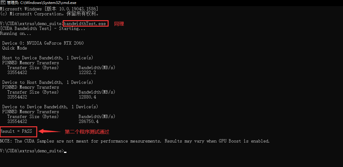 打开如下路径:..\CUDA\extras\demo_suite找到这两个文件,用命令行按照图示的序号依次运行deviceQuery.exe和bandwidthTest.exe,这两个程序。直接双击会闪退,你什么结果都看不到!
