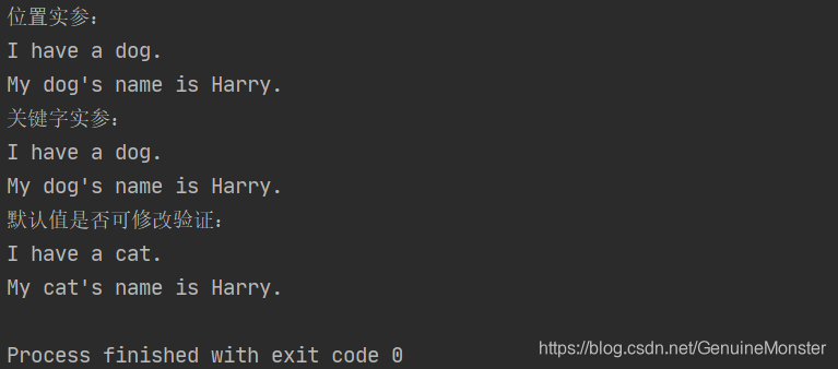 我们观察可以看到,describe_pet()函数的定义部分没有变,变得只是调用函数时的传参方式(关键字实参)。一旦使用关键字的实参,那么实参的顺序就无关紧要了,因为等号已经指定了实参与形参的对应关系。所以以下两种调用函数代码的输出结果是一致的。