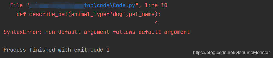上面这段代码为宠物类型指定了形参的默认值,那么我们只需要对宠物名称进行传参即可。我分别使用了两种传参方式,并且验证了一下“宠物类型虽然指定默认值,但仍旧可以传参的事实”。细心的同学观察到:上述代码在定义函数时,修改了形参的排列顺序(与之前的代码相比较)。假设,我们没有对形参的顺序进行修改,并且使用的是“位置实参”。如果此时调用函数,仅仅指定动物名称,那么就会出现下面的错误: