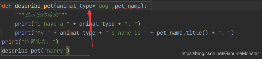 describe_pet(pet_name = 'harry',animal_type = 'hasmster')3、默认值
