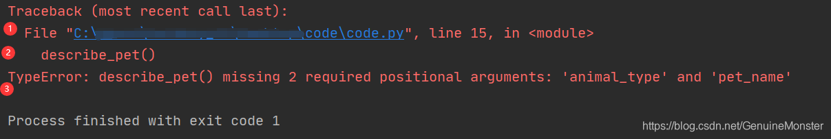 在1处:traceback指出了问题出现在什么地方;在2处,指出了导致问题的函数调用;在3处,traceback指出该函数调用少了两个参数,并指出了相应形参的名称。如果提供的实参多了,traceback也会出现类似的错误提示。