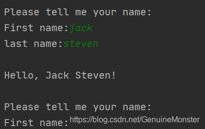 while True:print("\nPlease tell me your name:")f_name = input("First name:")l_name = input("last name:")formatted_name = get_formatted_name(f_name,l_name)print("\nHello, " + formatted_name + "!")