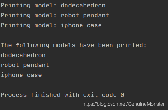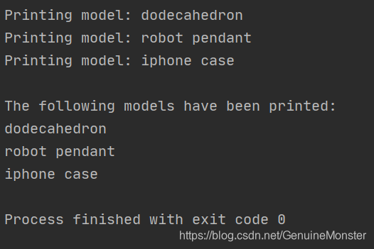completed_models = []# 模拟打印每个设计,直到没有未打印的设计为止