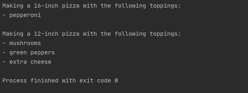 def make_pizza(size,*toppings):   # 带*号的意思是创建一个名为toppings的空元组,将收到的所有值都封装到这个元组内"""说明要制作的披萨"""print("\nMaking a " + str(size) + "-inch pizza with the following toppings:")for topping in toppings:print("- " + topping)make_pizza(16,'pepperoni')