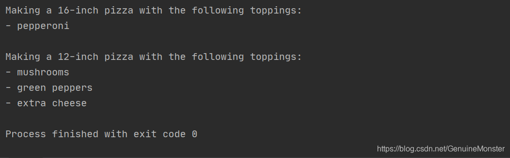 def make_pizza(*toppings):   # 带*号的意思是创建一个名为toppings的空元组,将收到的所有值都封装到这个元组内"""打印顾客点的所有配料"""print("\nMaking a pizza with the following toppings:")for topping in toppings:print("- " + topping)make_pizza('pepperoni')