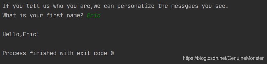 对上面的代码进行一个解释:函数input()接受一个参数:即要向用户显示的提示或说明,让用户知道该如何做。在这个例子中,Python运行第一行代码时,用户看到提示(让输入一句话),程序等待用户输入,并在用户按回车键后继续运行。输入的字符串存储在变量message中,最后被print()函数输出。