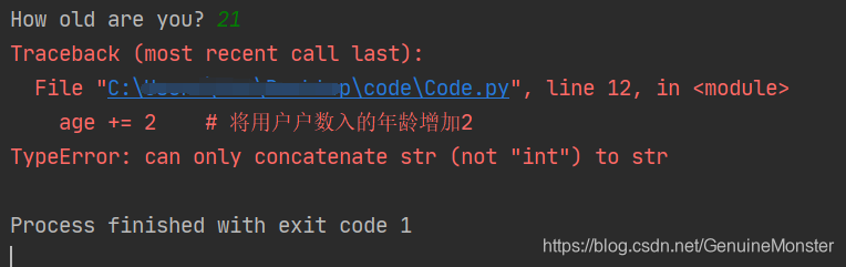 为什么会报错呢?就写了三行代码就报错了?21 + 2 = 23,直接输出23不就好了吗?这就是我文章开头说到的input()函数会将用户输入的内容以字符串的形式保存起来,字符串+2=?,所以编译器会报错。那为了解决这个问题,我们可以用int()函数来进行对用户年龄的获取。改正代码如下所示: