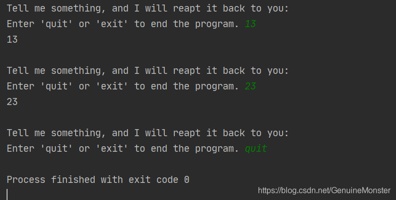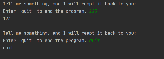 while message != 'quit':message = input(prompt)print(message)
