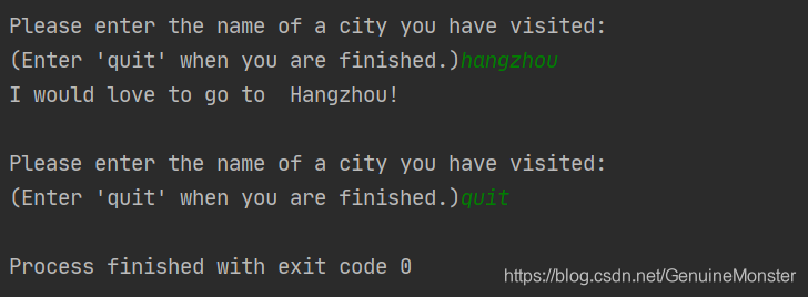 prompt += "\n(Enter 'quit' when you are finished.)"while True:city = input(prompt)if city == 'quit':breakelse:print("I would love to go to  " + city.title() + "!")