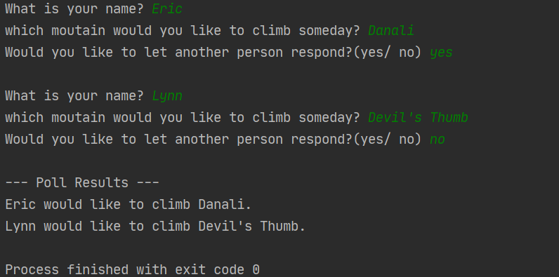 polling_active = Truewhile polling_active:#提示输入被调查者的名字和回答name = input("\nWhat is your name? ")response = input("which moutain would you like to climb someday? ")# 将答卷存储在字典中responses[name] = response# 看看是否还有人要参加调查repeat = input("Would you like to let another person respond?(yes/ no) ")if repeat == 'no':polling_active = False