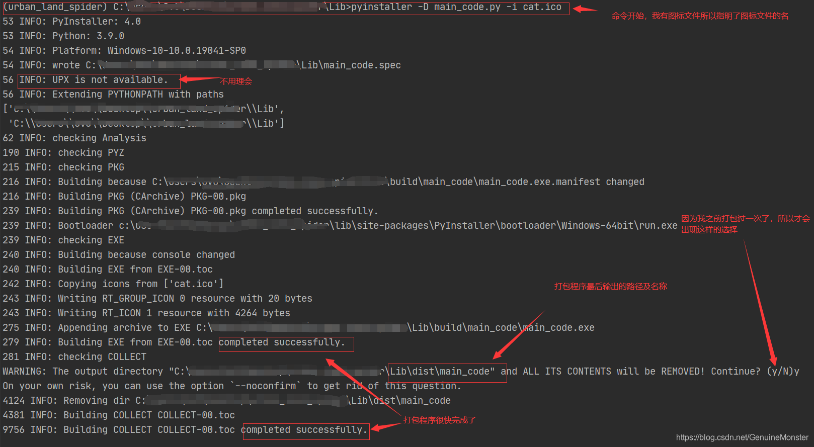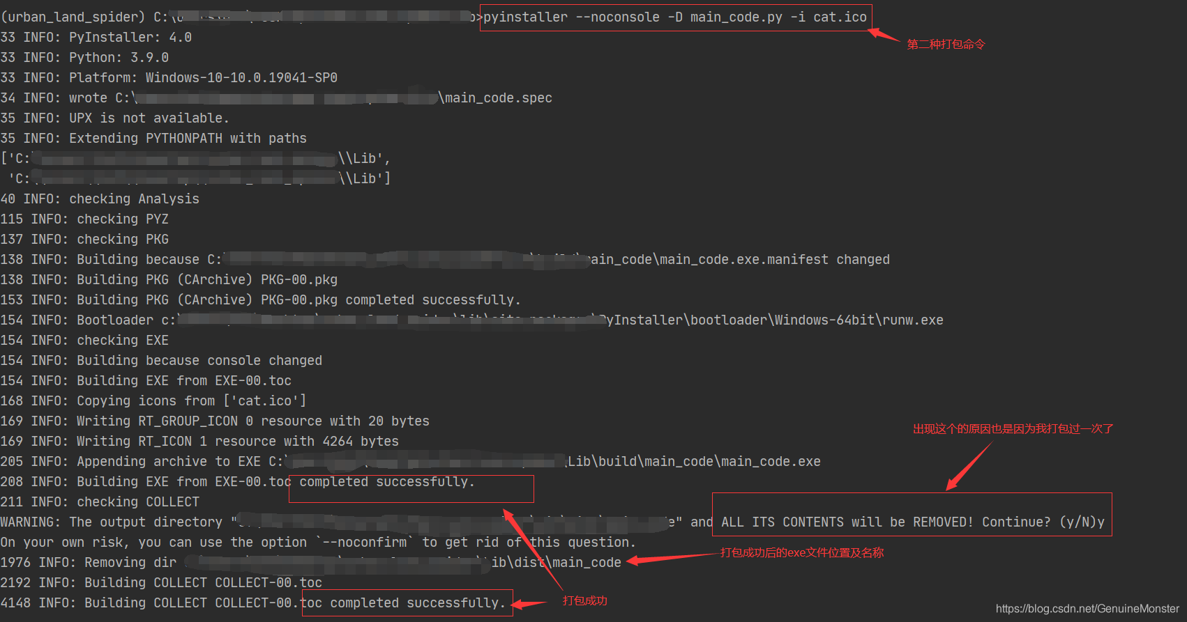 pyinstaller --noconsole -D main_code.py -i cat.ico其中--noconsole就是取消“窗口控制台”黑框的命令选项,这个命令是等到程序一切正常后才使用的。所以我先前就说了,一定要按照我介绍的顺序打包两次,这样才可以保证打包的成功率。下图是使用第二种命令打包成果的Terminal截图。