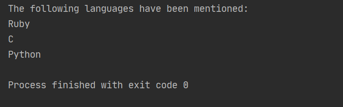 前面的例子中,使用字典存储一个对象(游戏中的一个外星人)的多种信息,接下来我们使用字典存储众多对象中的同一种信息。例如存储多个人喜欢的编程语言。代码如下: