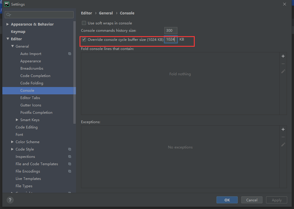 随后,我在网上查阅了相关资料,起初发现大家编码方式和我的不尽相同,但是似乎没有遇到和我一样的问题,所以我大胆猜测估计是什么东西存不下这么多数字才导致这个BUG产生的。经过我5min的调查后发现,是Pycharm软件的控制台周期缓冲区大小默认是1024KB,存不下这么多数(64位Python,数字“0”占用内存24个字节,数字“1”占用内存28个字节)如图所示: