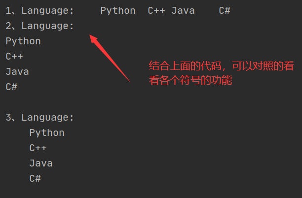 print("3、Language:\n\tPython\n\tC++\n\tJava\n\tC#\n\t") #输出有制表符和换行