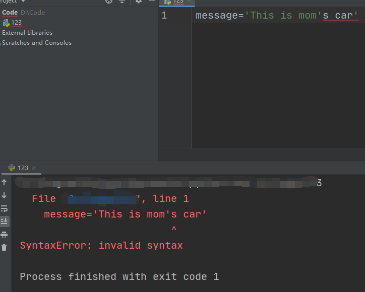 注:在用单引号引起的字符串中,如果包含撇号,就会导致错误(原因:Python解释器会将第一个单引号和撇号之间的内容视为一个字符串,进而将余下的文本视为Python代码)