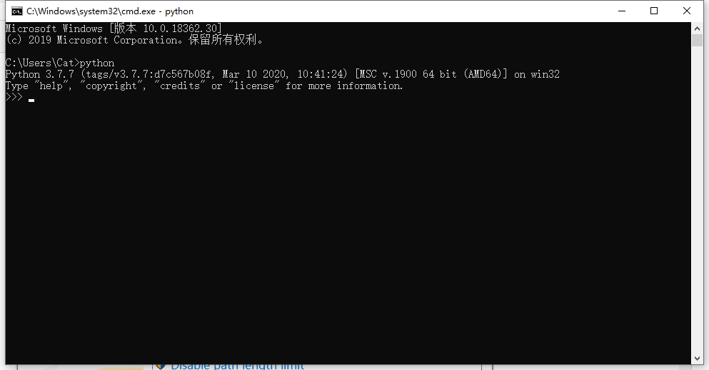 验证:键盘windows+R键,打开运行对话框,输入“cmd”,打开控制台后,输入“python”。出现以下图片即成功安装Python。