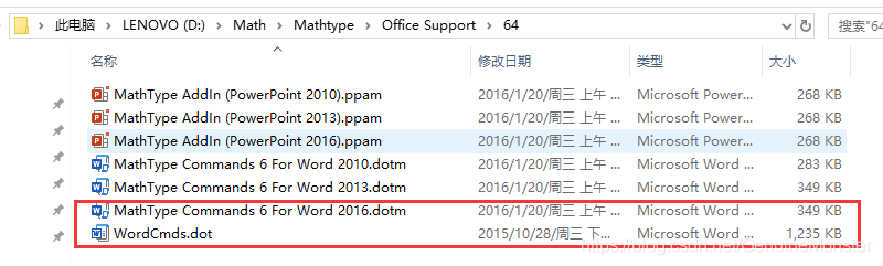 c:根据自己电脑的操作系统,选择对应的文件夹,“如32位系统就选名称为32的文件夹”,分别复制文件夹里的“MathPage.wll”,“MathType Commands 6 For Word 2016.dotm”和“WordCmds.dot”三个文件,如下图所示: