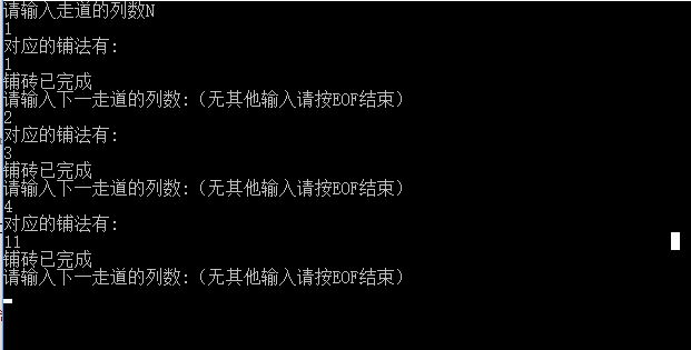 {int n;cout << "请输入走道的列数N" << endl;while (cin >> n){if (n == 0){cout << "输入有误,请重新输入!" << endl;continue;}cout << "对应的铺法有:" << endl;cout << pave(n) << endl;cout << "铺砖已完成" << endl;cout << "请输入下一走道的列数:(无其他输入请按EOF结束)" << endl;}return 0;