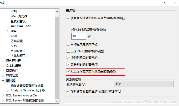 将“阻止保存要求重新创建表的更改” 前面的勾取消掉就OK了!