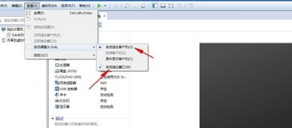 打开VMware在上方菜单栏里,点击“查看”—>“自动调整大小”,选中“自动适应客户机”、“自动适应窗口”