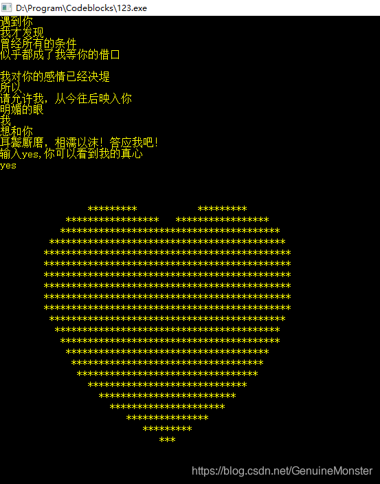 {char answer[10];printf("遇到你\n我才发现\n曾经所有的条件\n似乎都成了我等你的借口\n\n");printf("我对你的感情已经决堤\n所以\n请允许我,从今往后映入你\n明媚的眼\n");printf("我\n想和你\n耳鬓厮磨,相濡以沫!");printf("答应我吧!\n输入yes,你可以看到我的真心\n");scanf("%s", answer);char b[4]="yes";if(strcmp(answer,b)==0){float y, x, z, f;for (y = 1.5f; y > -1.5f; y -= 0.1f){for (x = -1.5f; x < 1.5f; x += 0.05f){z = x * x + y * y - 1;f = z * z*z - x * x*y*y*y;putchar(f <= 0.0f ? "*********"[(int)(f*-8.0f)] : ' ');}putchar('\n');}long time;for (;;){system("color a");for (time = 0; time<99999999; time++);system("color b");for (time = 0; time<99999999; time++);system("color c");for (time = 0; time<99999999; time++);system("color d");for (time = 0; time<99999999; time++);system("color e");for (time = 0; time<99999999; time++);system("color f");for (time = 0; time<99999999; time++);system("color 0");for (time = 0; time<99999999; time++);system("color 1");for (time = 0; time<99999999; time++);system("color 2");for (time = 0; time<99999999; time++);system("color 3");for (time = 0; time<99999999; time++);system("color 4");for (time = 0; time<99999999; time++);system("color 5");for (time = 0; time<99999999; time++);system("color 6");for (time = 0; time<99999999; time++);system("color 7");for (time = 0; time<99999999; time++);system("color 8");for (time = 0; time<99999999; time++);system("color 9");}getchar();}else{printf("\n好吧,那就相忘于江湖吧!\n");}return 0;