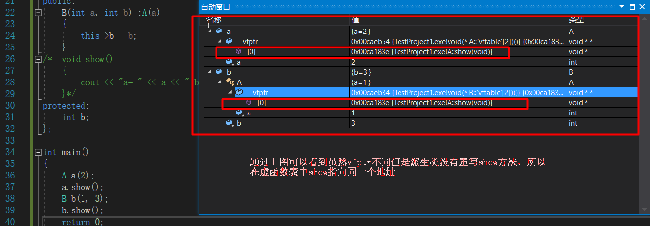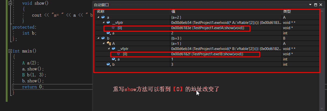 可以看出,两个类的__vfptr的值不同,但是每个槽内部的函数地址都是相同的。