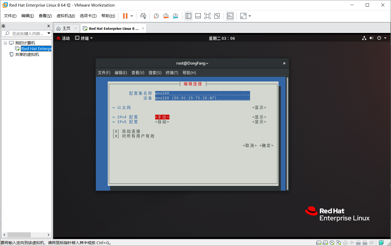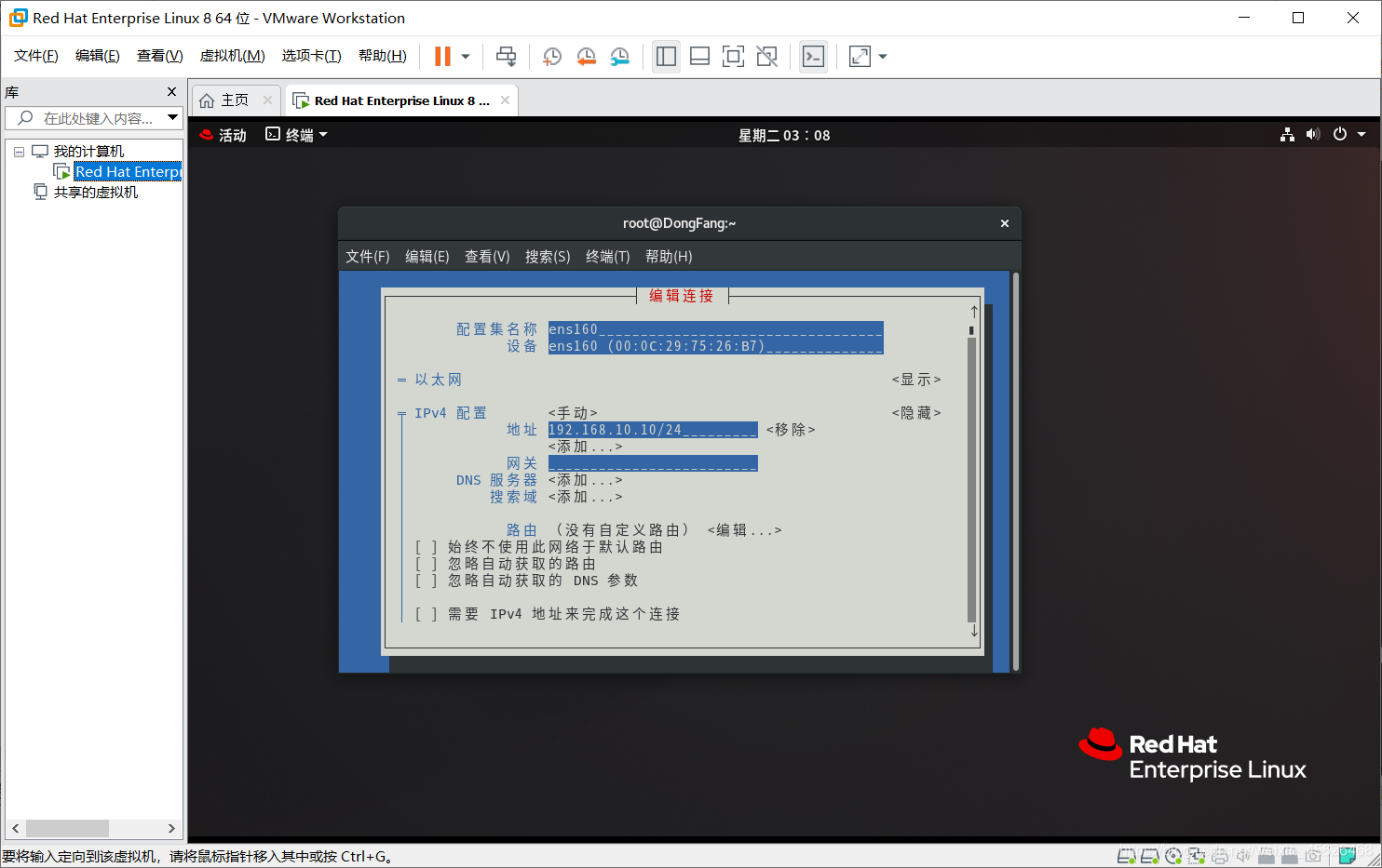 使用con-name参数指定会话名称,然后依次用ifname参数指定本机的网卡名称,用autoconnect no 参数设置该网络会话默认不被自动激活,以及用ip4及gw4参数手动指定网络的IP地址: