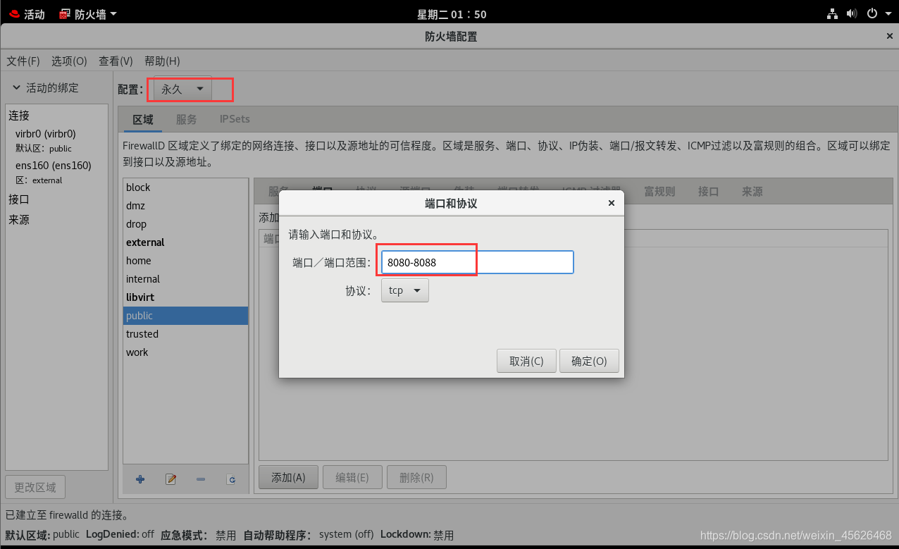 首先选中永久,然后点击端口,添加端口,输入端口号范围