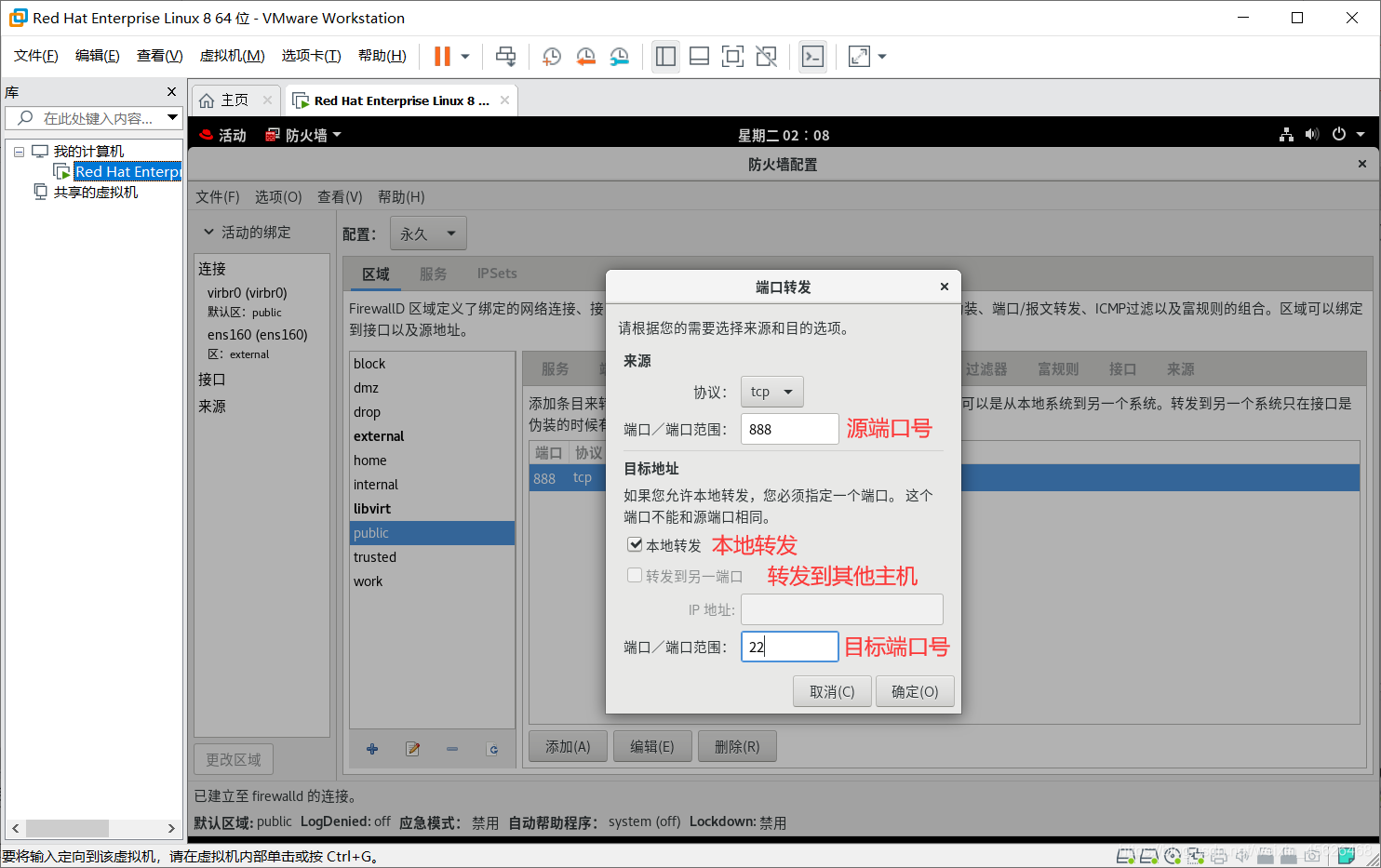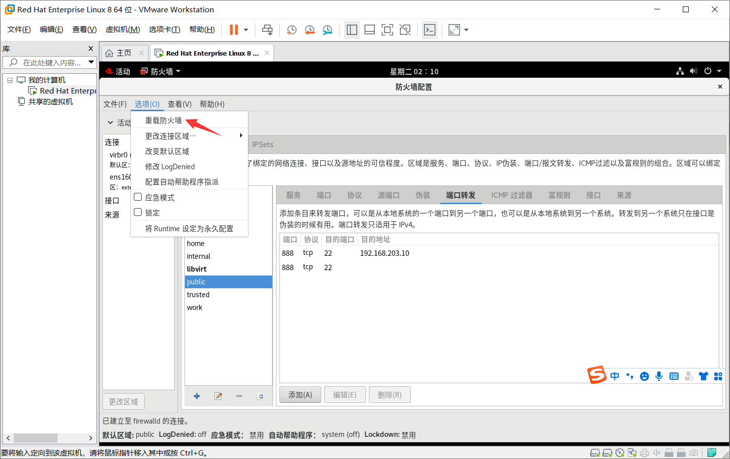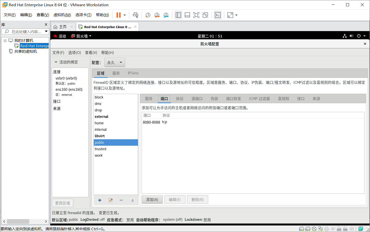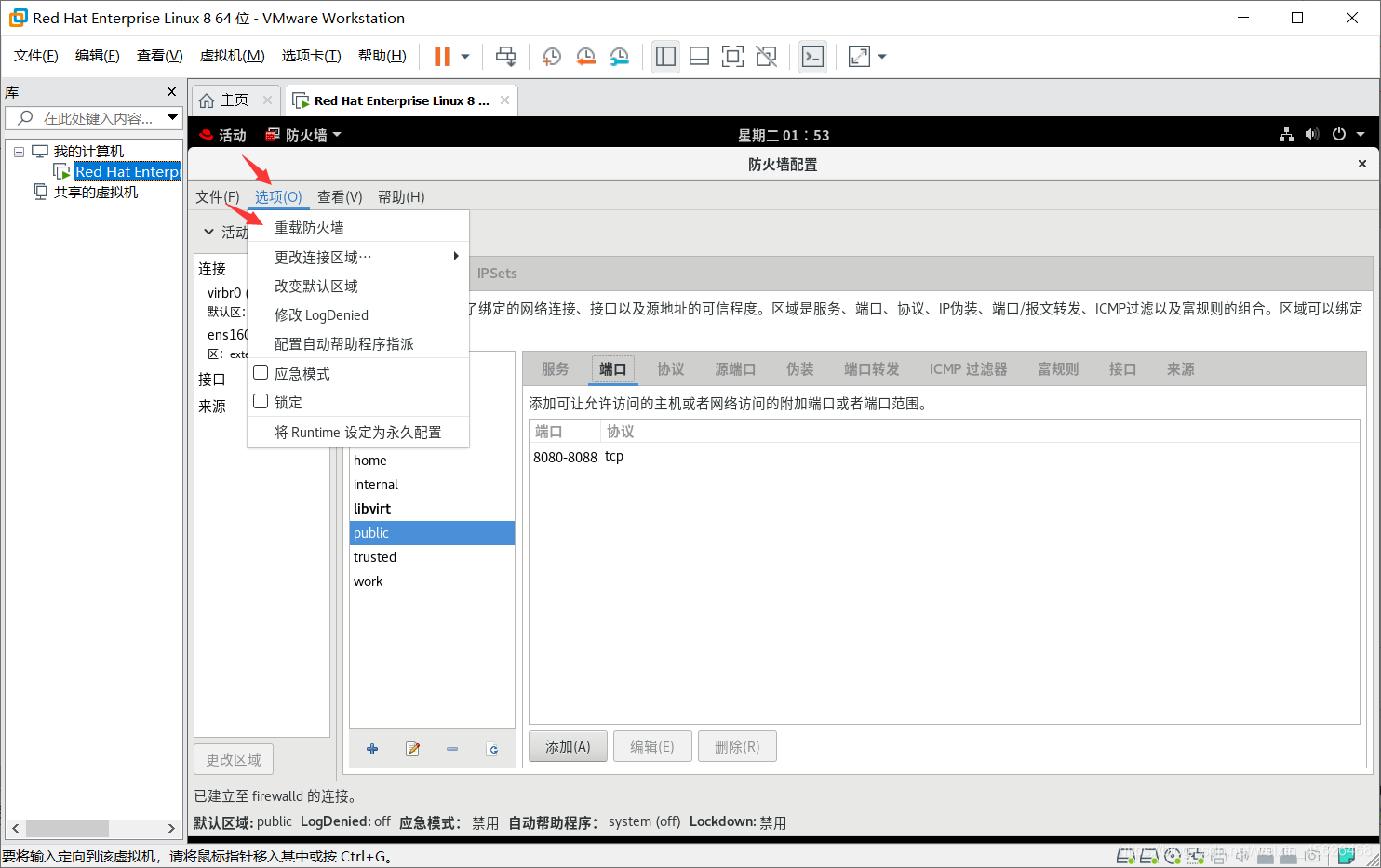 尝试添加一条防火墙策略规则,使其放行访问8080-8088端口(TCP协议)的流量,并将其设置为永久生效,以达到系统重启后防火墙策略依然生效的目的。配置完毕后还需要重载防火墙,这与在命令行中执行--reload参数的效果一样