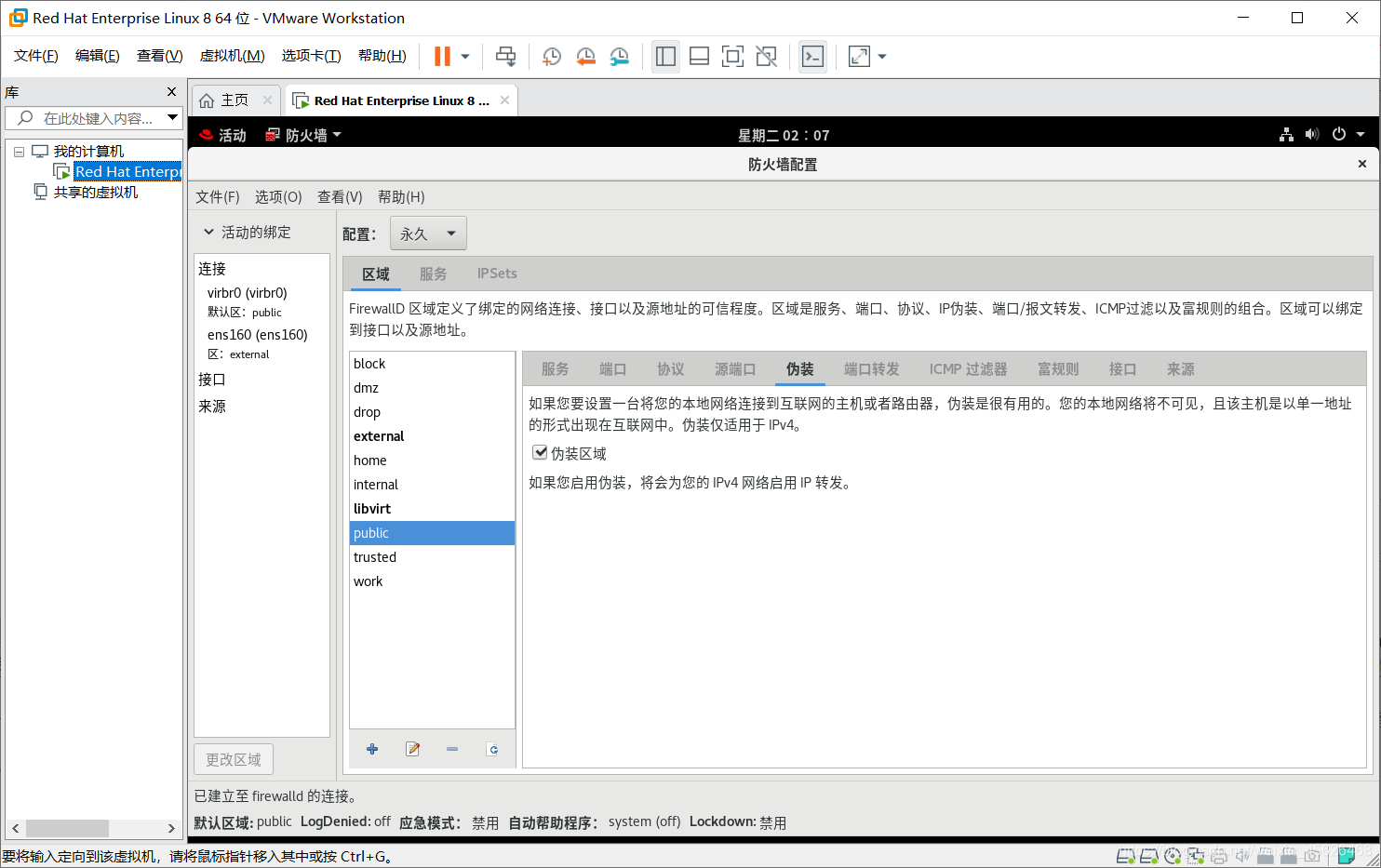使用iptables命令实现SNAT技术是一件麻烦的事情,但是firewall-config中却是小菜一碟了,用户只需勾选Masquerade zone(伪装区)复选框,就自动开启了SNAT技术