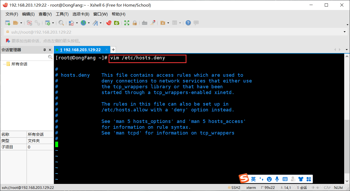 我们使用Vi/Vim编辑/etc/hosts.deny文件即可配置