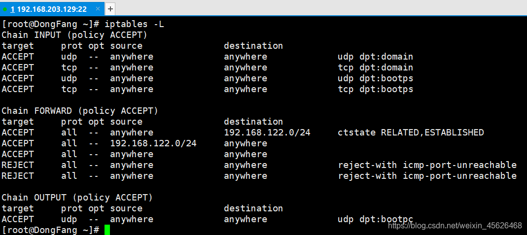 在iptables命令后加 -L 参数查看已有的防火墙规则链
