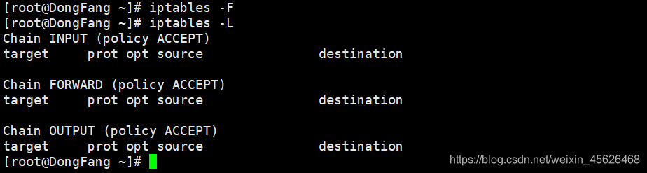 在iptables命令后加 -F 参数清空已有的防火墙规则链