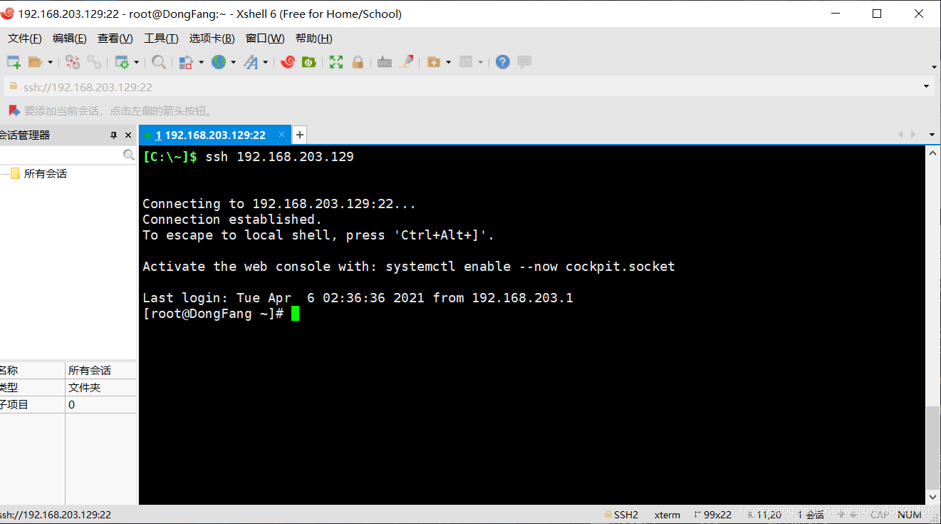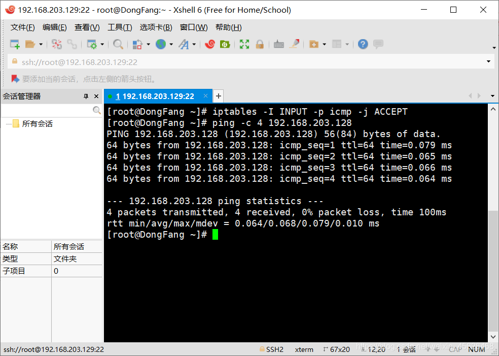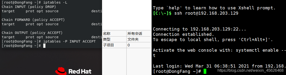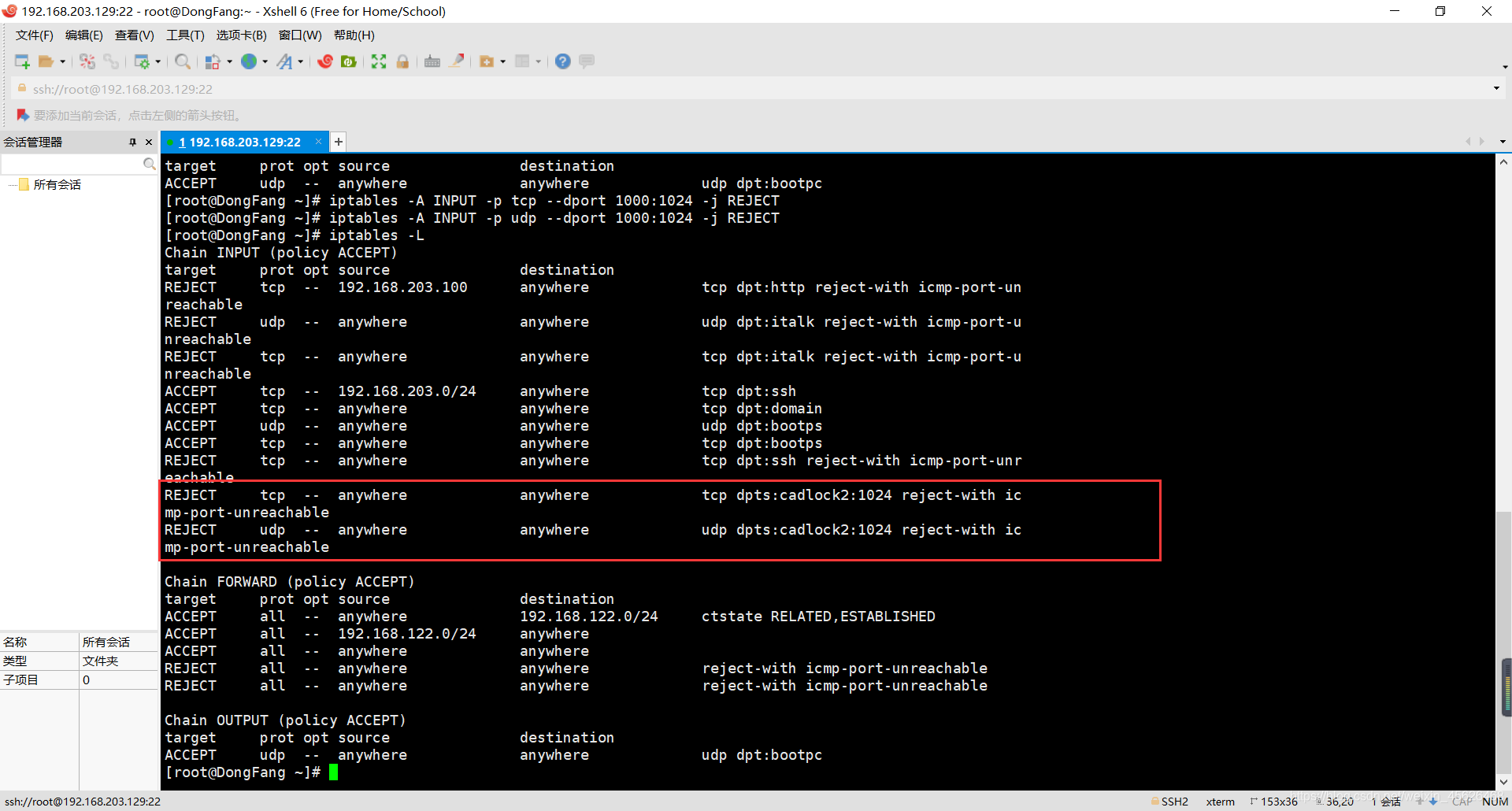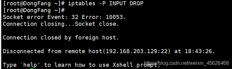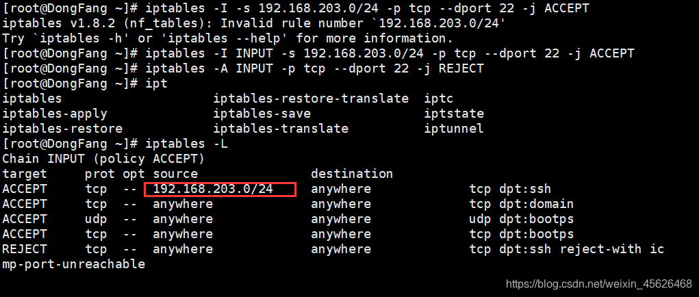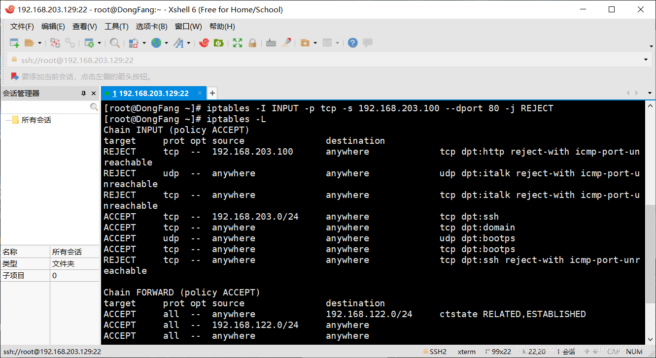 在设置完上述INPUT规则链之后,我们使用192.168.203.0/24网段内主机访问服务器的22端口,效果如下