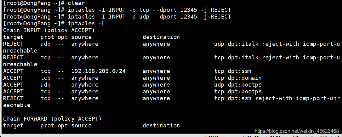 向INPUT规则链中添加拒绝所有人访问本机12345端口的策略规则: