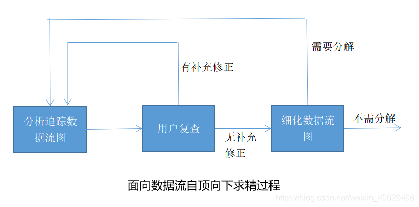 复查过程验证了e知的元素,补充了未知的元素,填补了文档中的空白。反复进行上述分析过程,分析员越来越深人地定义了系统中的数据和系统应该完成的功能。为了追踪更详细的数据流,分析员应该把数据流图扩展到更低的层次。通过功能分解可以完成数据流图的细化。