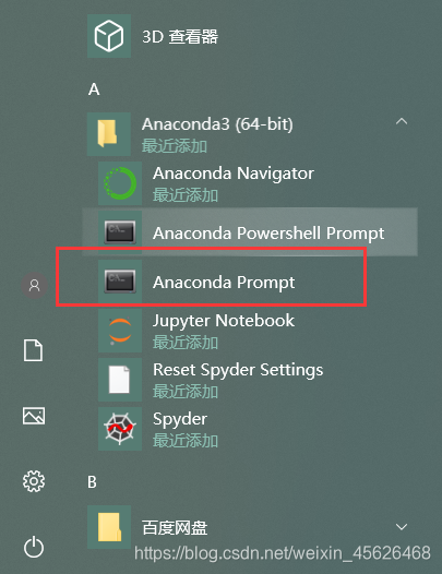 2.安装完成Anaconda之后,在开始菜单中找到Anaconda Prompt打开