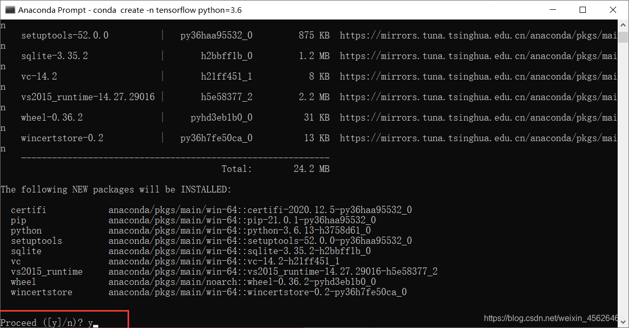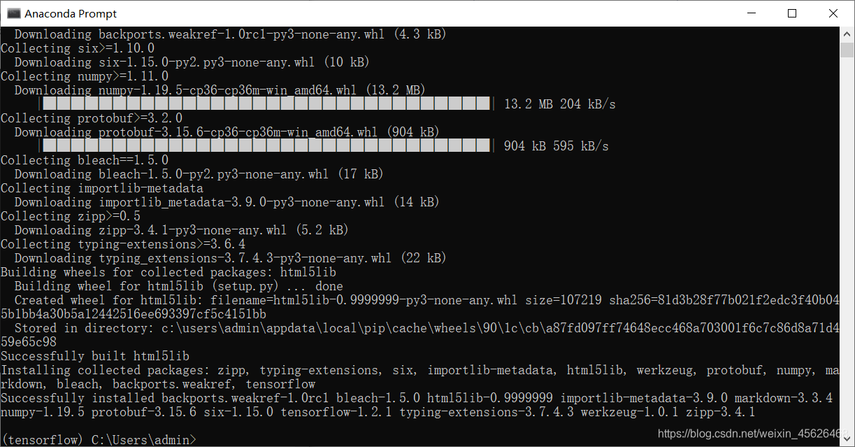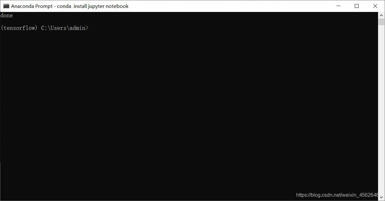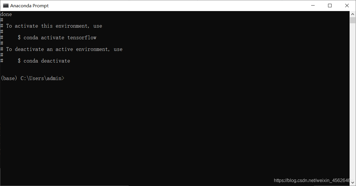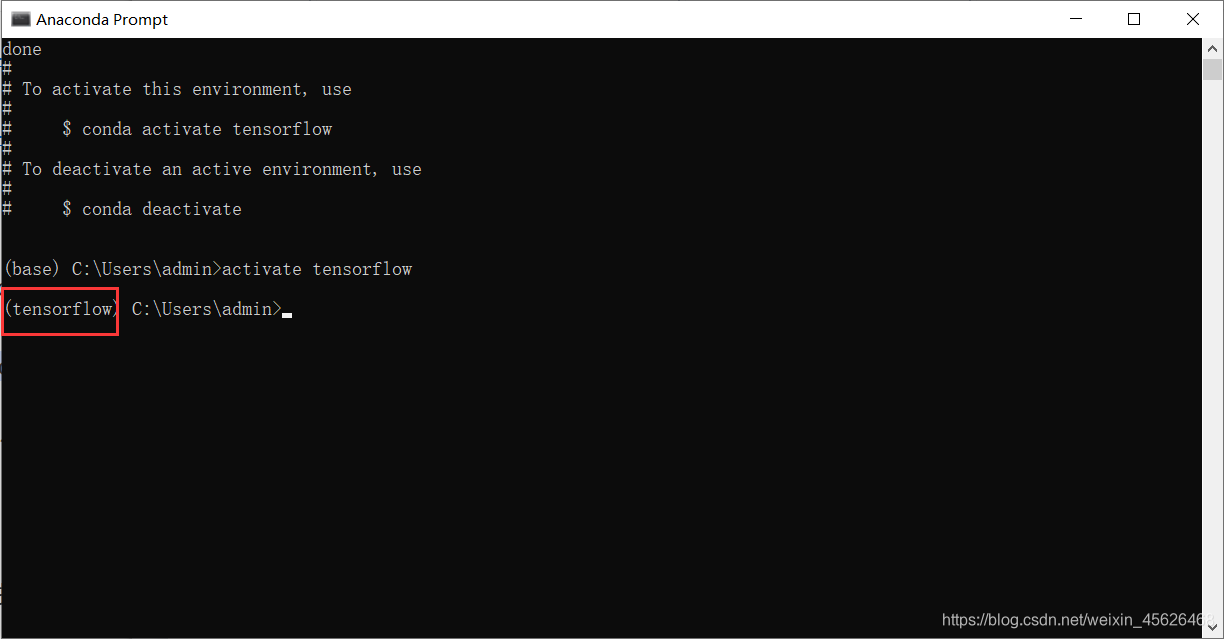 输入命令:activate tensorflow(每次重新打开anaconda时都需要用此语句激活环境)
