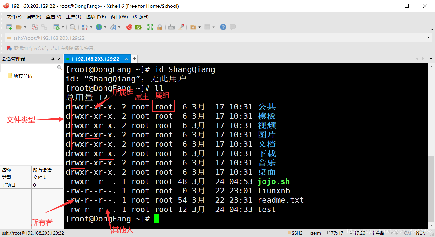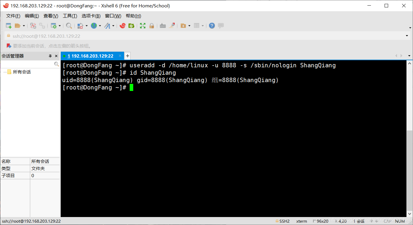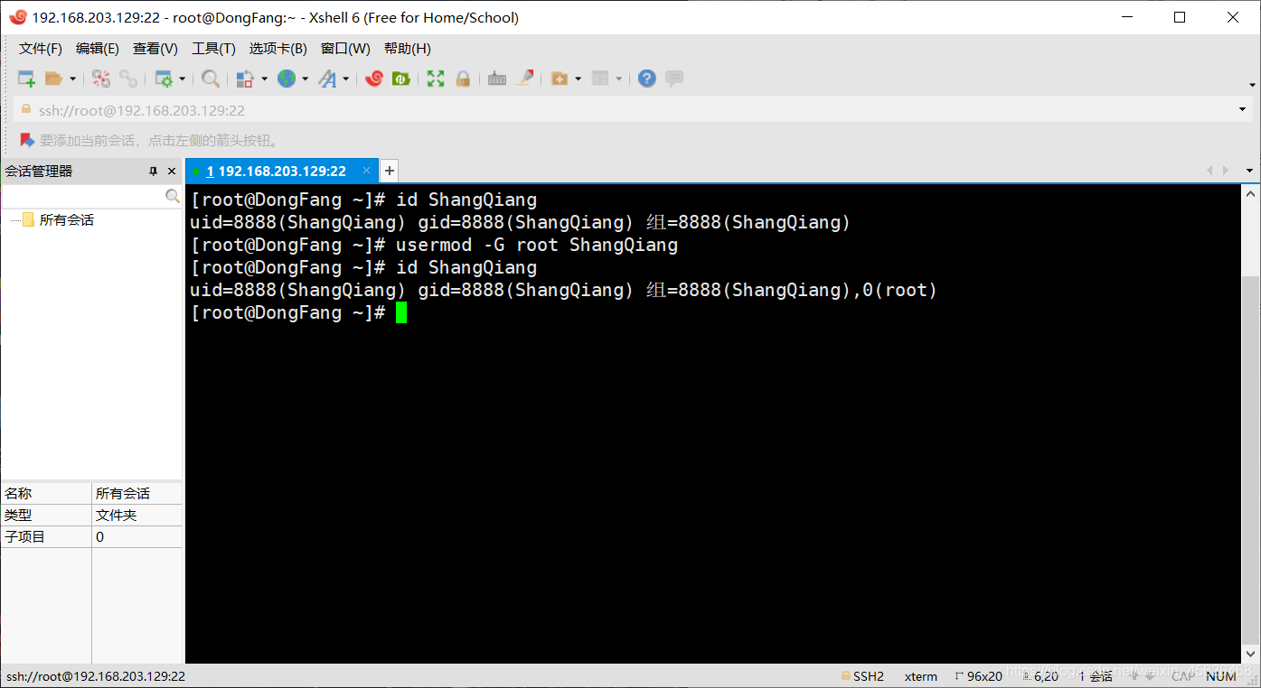 我们先查看ShangQiang的默认信息,然后将他加入到root用户组中去,再次查看ShangQiang的信息,这样扩展组列表中则会出现root用户组的字样,而基本组不会收到影响