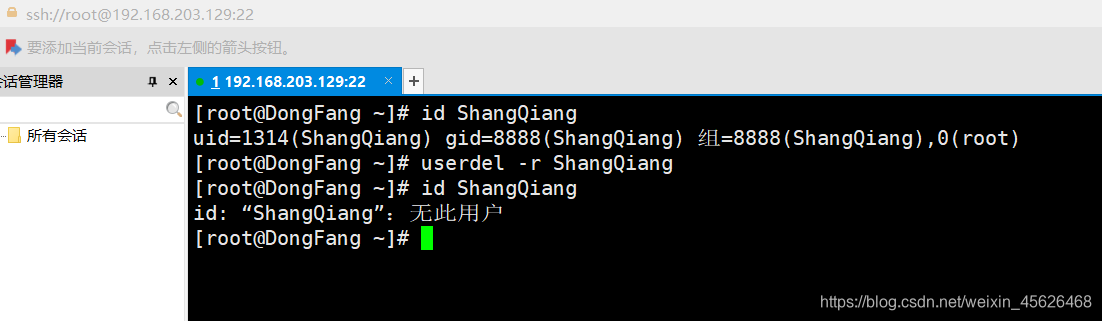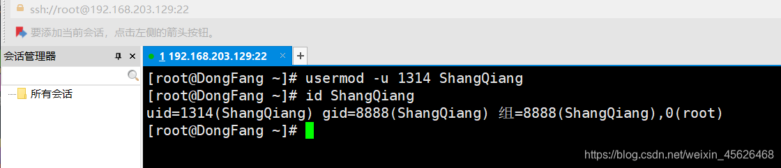 再来试试用-u参数修改ShangQiang的用户UID号码。除此之外,我们还可以用-g参数修改用户的基本组ID,用-G参数修改用户扩展组ID