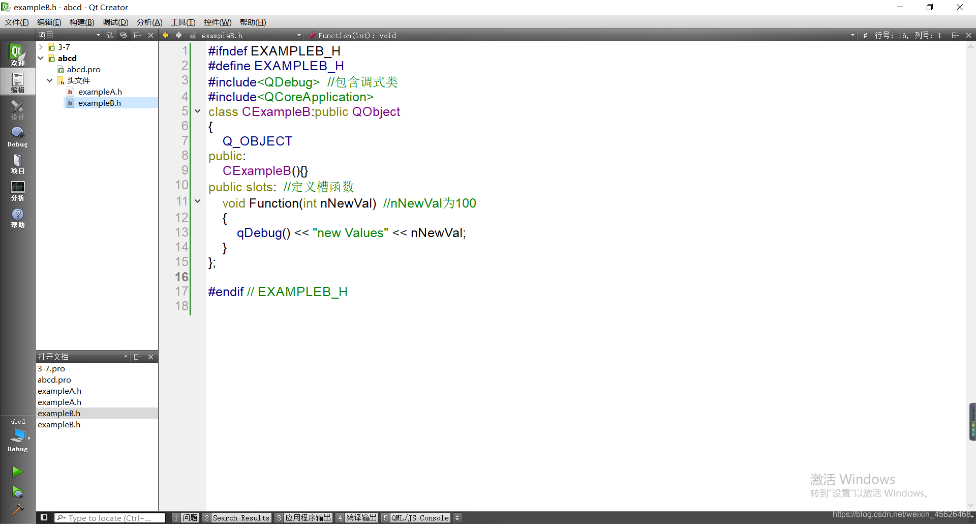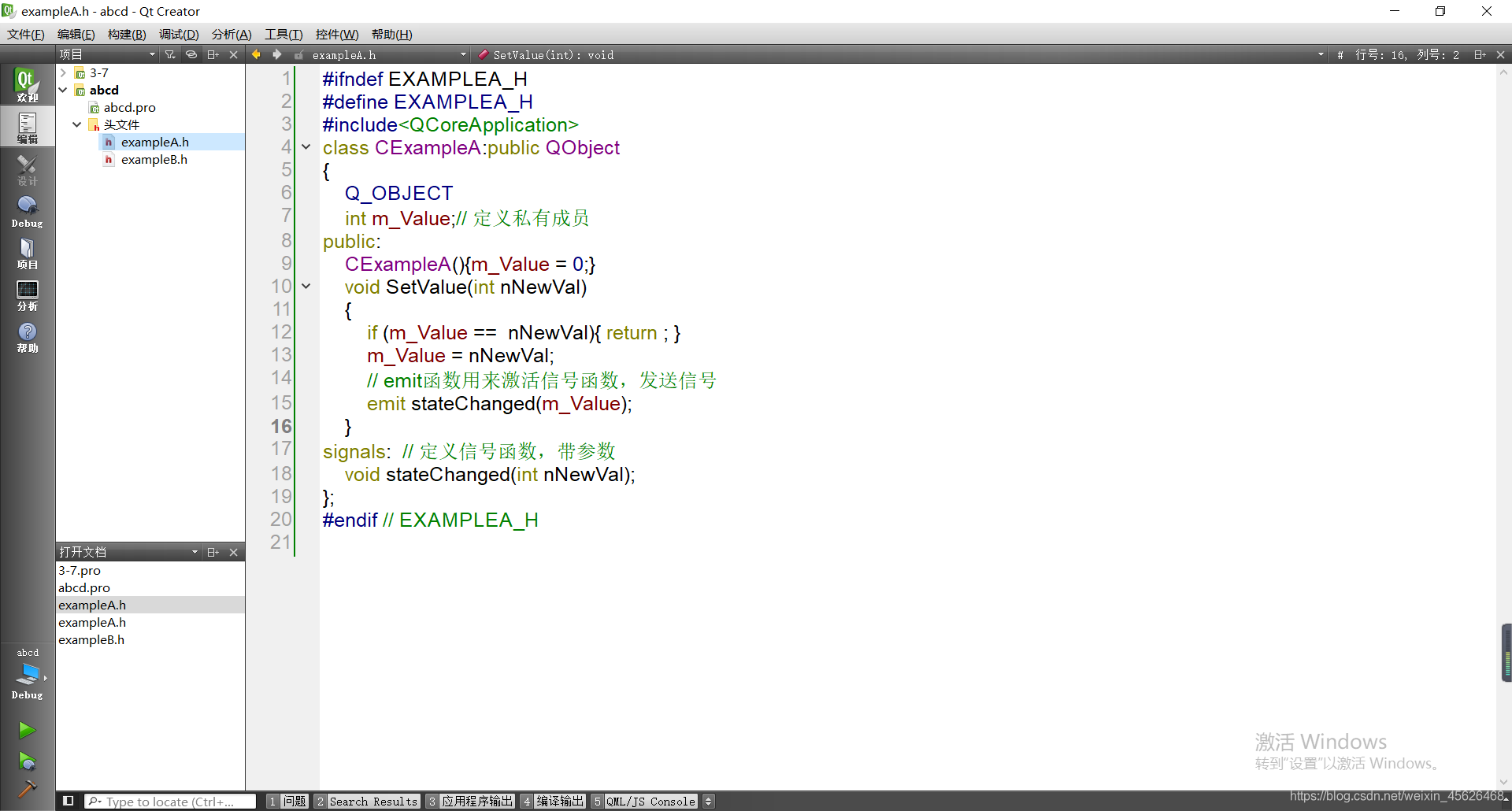 public:CExampleA(){m_Value = 0;}void SetValue(int nNewVal){if (m_Value == nNewVal){ return ; }m_Value = nNewVal;// emit函数用来激活信号函数,发送信号emit stateChanged(m_Value);}