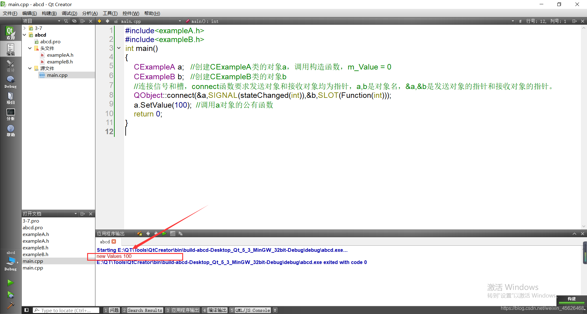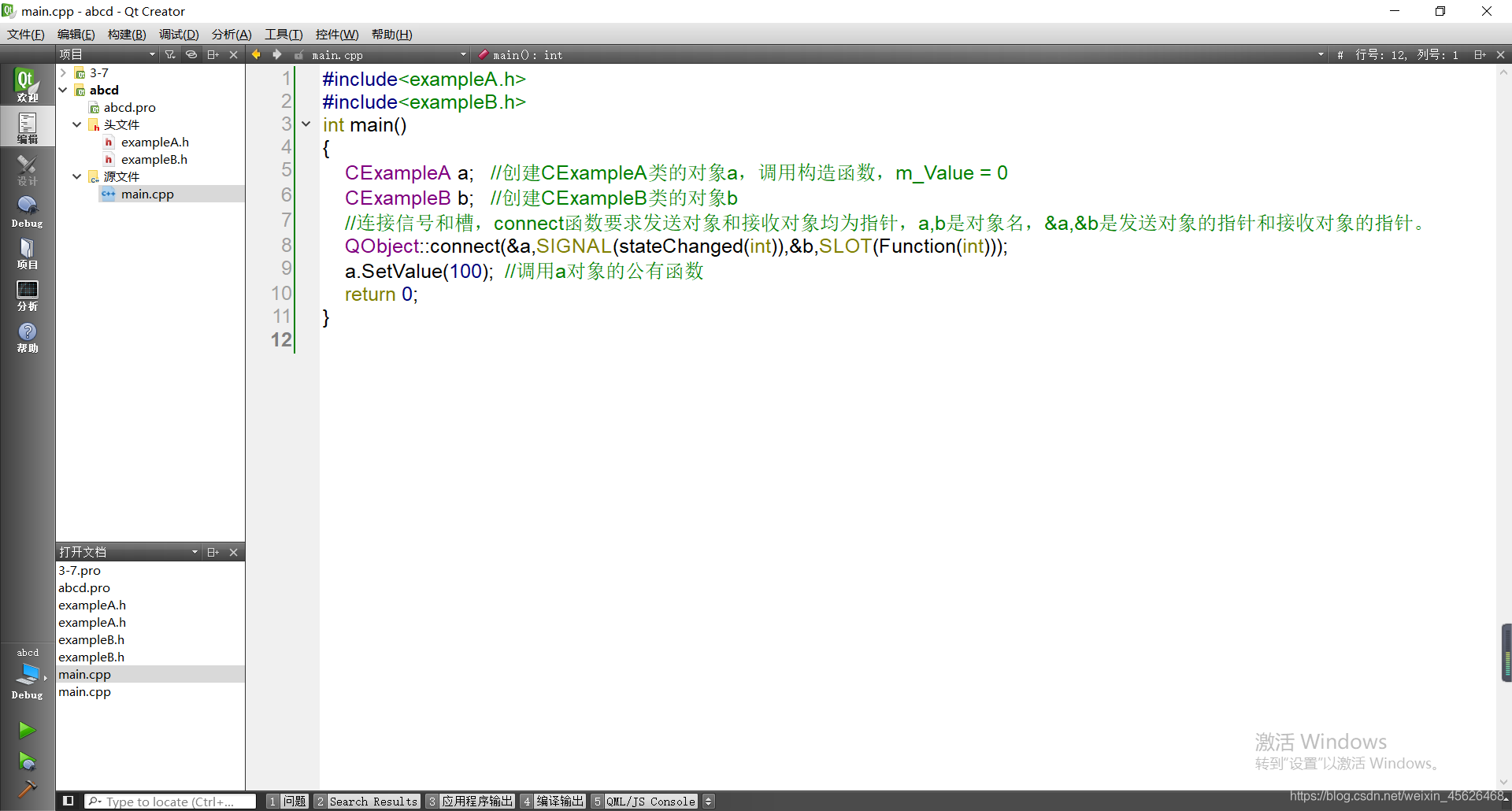 {CExampleA a; //创建CExampleA类的对象a,调用构造函数,m_Value = 0CExampleB b; //创建CExampleB类的对象b//连接信号和槽,connect函数要求发送对象和接收对象均为指针,a,b是对象名,&a,&b是发送对象的指针和接收对象的指针。QObject::connect(&a,SIGNAL(stateChanged(int)),&b,SLOT(Function(int)));a.SetValue(100); //调用a对象的公有函数return 0;
