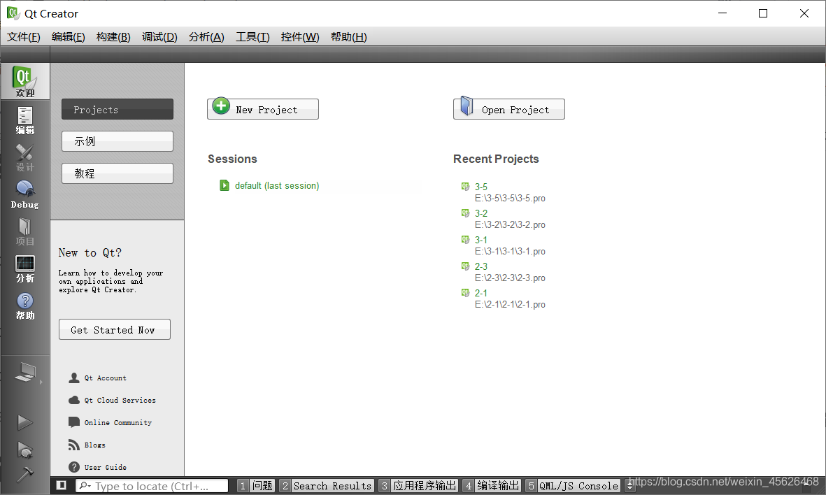 “帮助”菜单:包含Qt帮助,Qt Creator版本信息和插件管理等菜单项