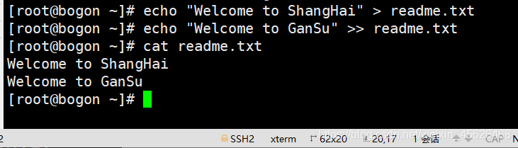 [root@bogon ~]# echo "Welcome to ShangHai" > readme.txt #覆盖了原有文件的内容