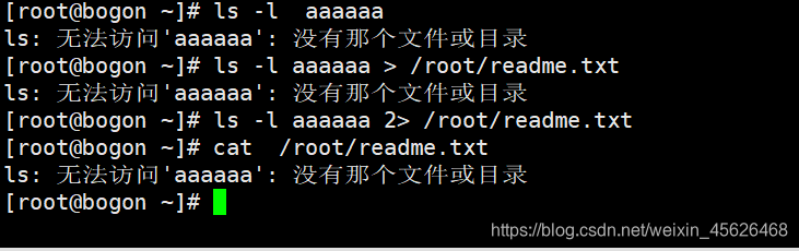 [root@bogon ~]# ls -l aaaaaa 2> /root/readme.txt