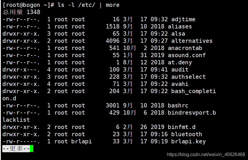 这个管道符就很方便,我们可以将它套用到其他不同的命令上。比如用翻页的形式查看/etc目录中的文件列表及属性