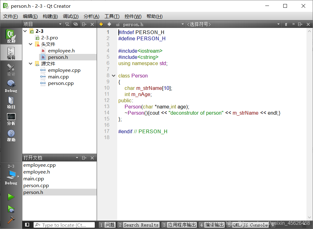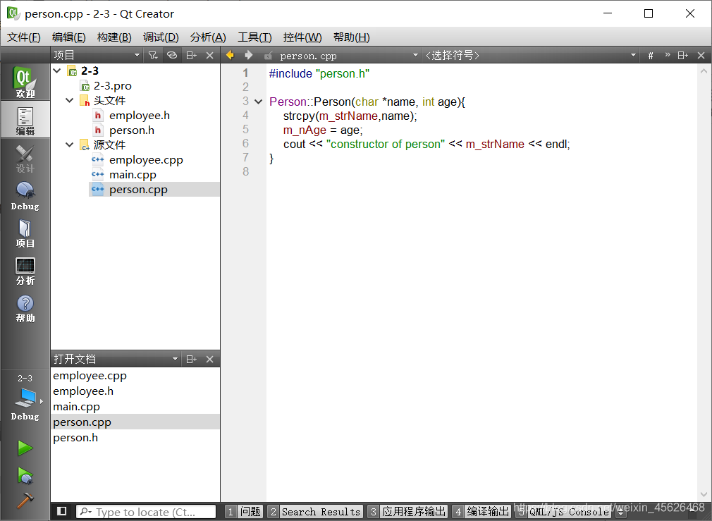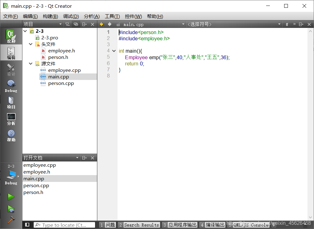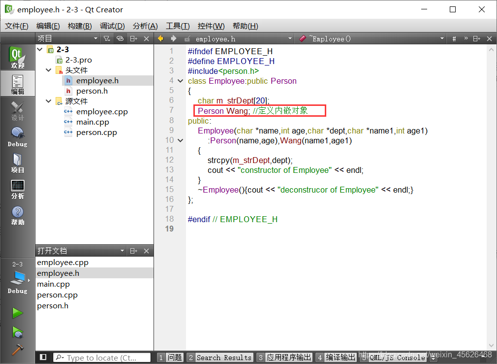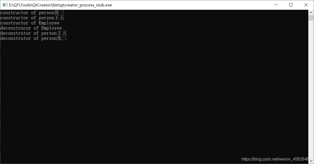 从输出结果可以清楚地看出,构造函数执行顺序为先祖先(Person 张三),后客人(Person 王五),最后自己(Employee),这里Wang是Person类只的一个对象,被派生类Emoloyee所有。
