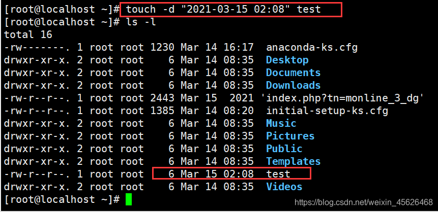 [root@localhost ~]# touch -d "2021-03-15 02:08" test